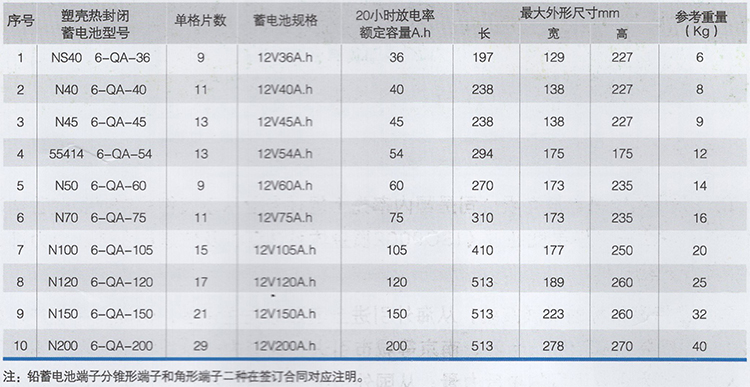 全塑壳热封闭蓄电池适应于各种汽车、船舶及其他内燃机的起动、点火和照明,还适用于家庭电器、风力和太阳能等发电的储蓄。这种蓄电池的正极板管式,负极板为涂膏式,还有正负极板都为涂膏式,采用纤维袋式隔板及塑料胶壳。电池槽与盖之间的封口是专用设备热封。●起动用铅酸蓄电池基本参数及外形尺寸